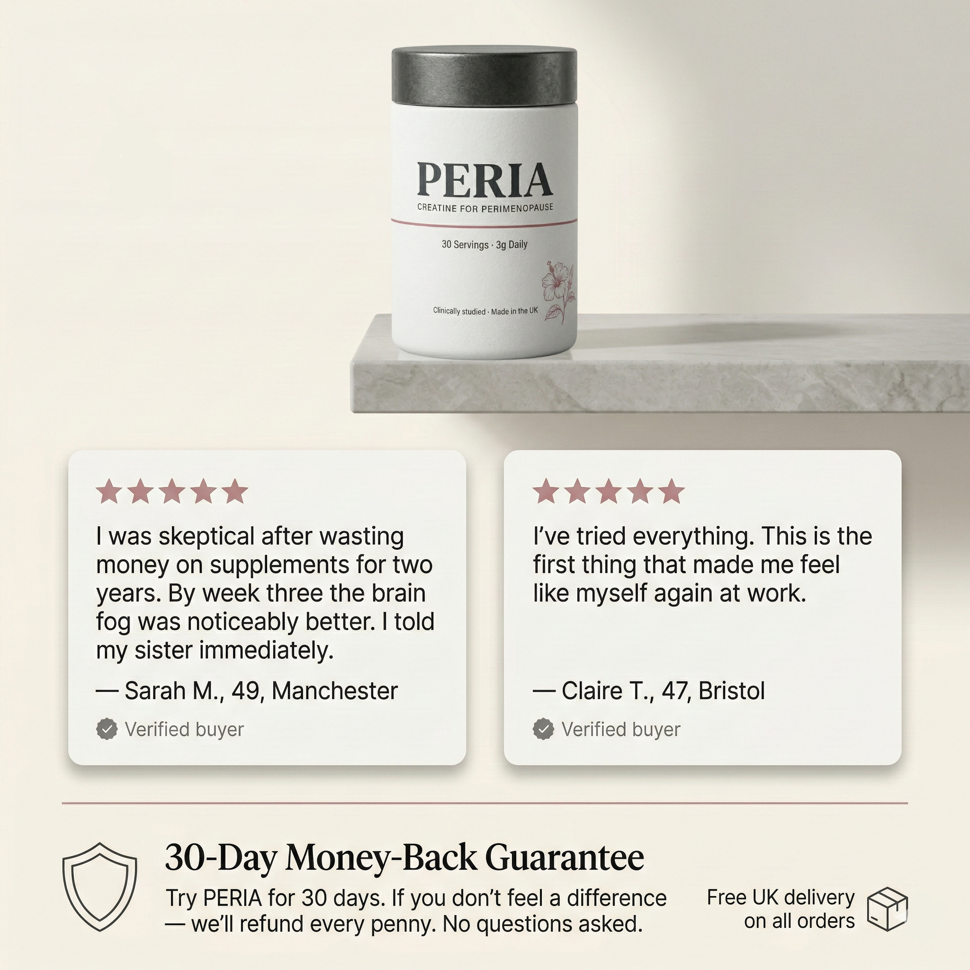 Try PERIA for 30 days. If you don't feel a difference — we refund every penny. No forms, no return shipping, no questions asked. We offer this because we know it works. And we want you to know it too.